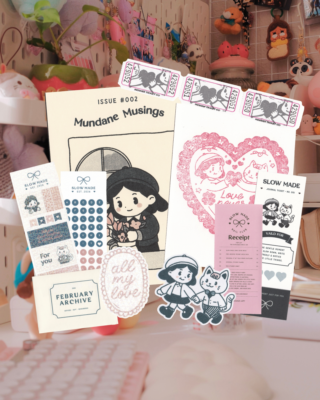 Each envelope is a thoughtfully curated collection of original art, stickers, paper goods, and a monthly archive pocket—all created to help you slow down and gently document daily life. Every piece is made slowly and in-house, from my desk to yours.